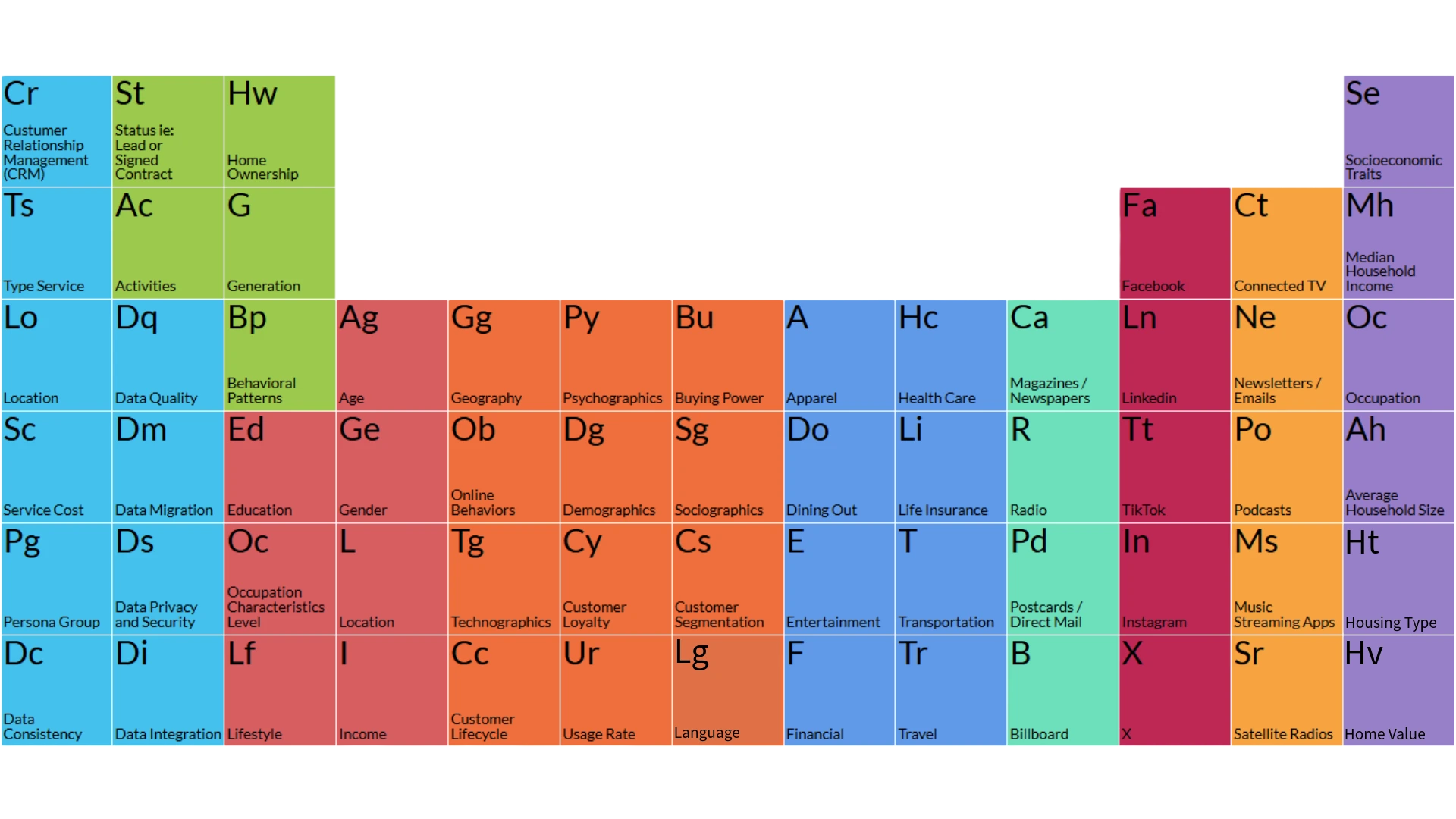 Our Customer Persona Periodic Table organizes 118 key marketing elements into color-coded categories, turning complex audience data into clear, actionable insights.
